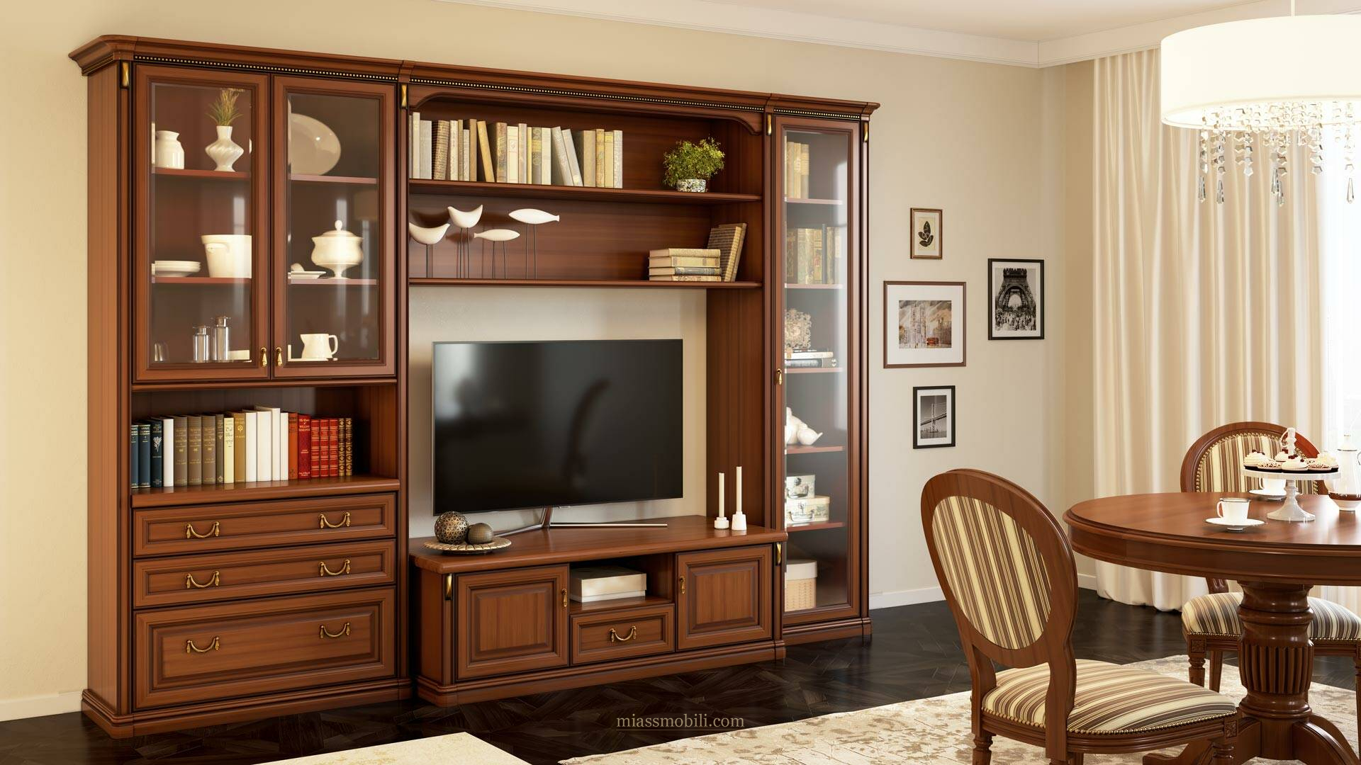 - шкаф 2-дверный, состоящий из верхней секции со стеклянными дверями и полками (для размещения предметов, используемых в комнатах типа гостиной), открытой ниши и трех выдвижных ящиков;