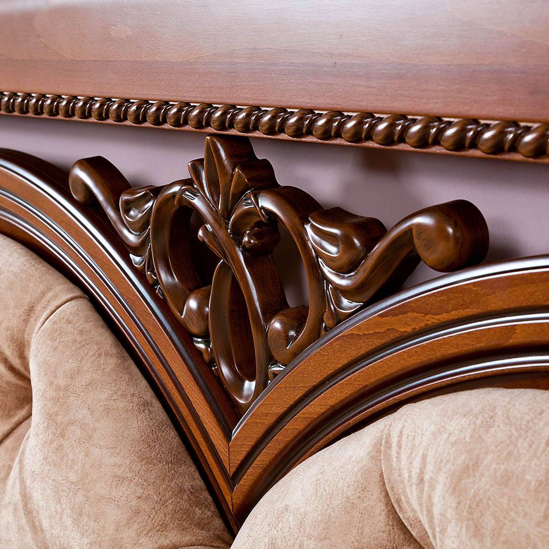 и делают узнаваемым облик всего набора. Головная спинка кровати с мягкой тканевой вставкой драпирована в лучших традициях классики и может служить прекрасным дополнением кровати.